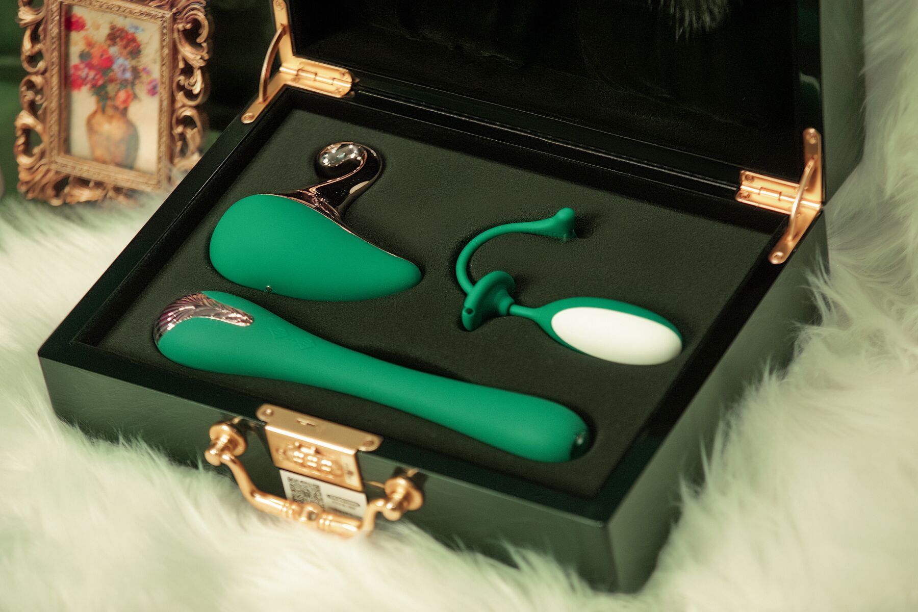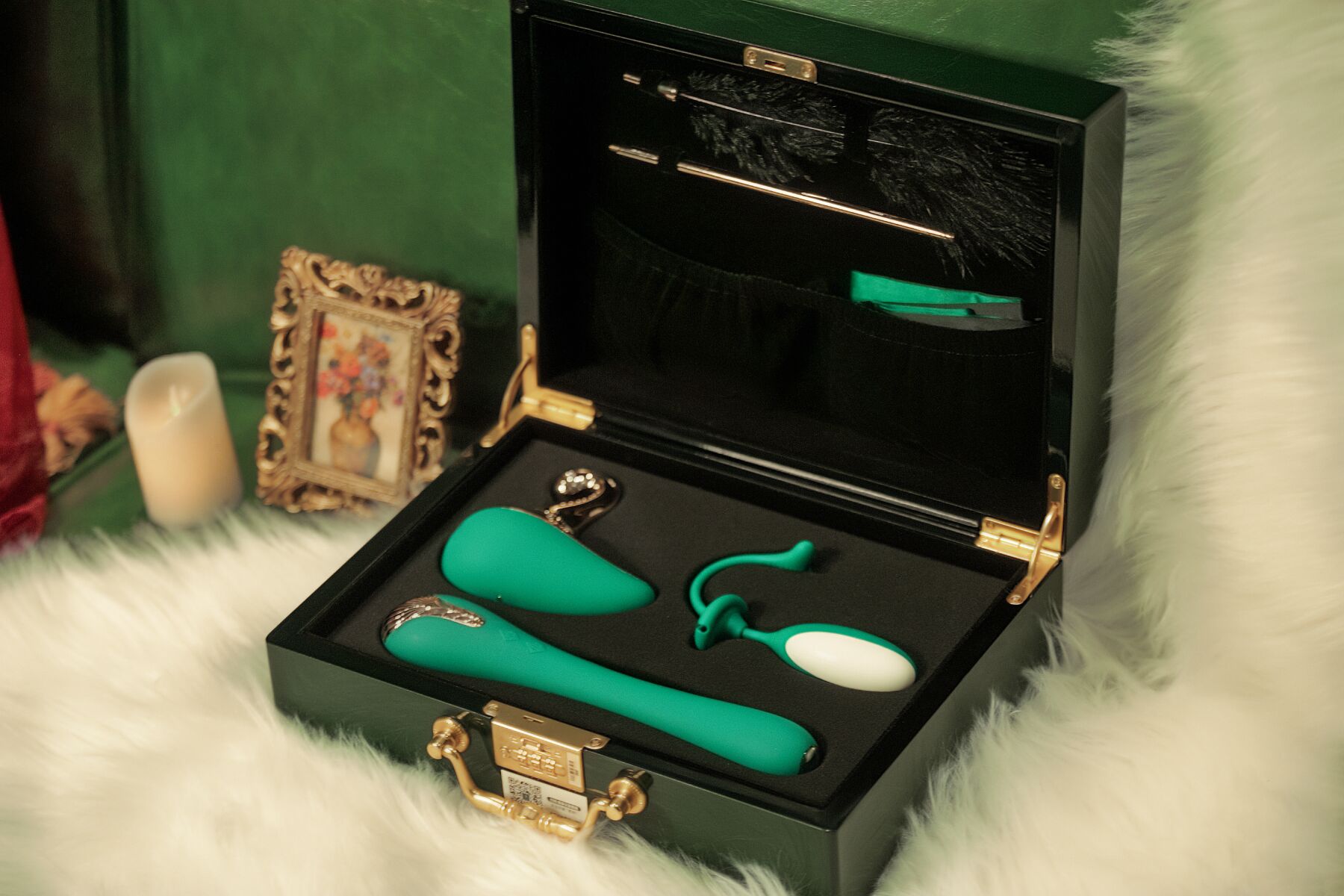 Кейc Pandora Box выполнен из материала под полированное дерево с золотистой фурнитурой и оснащен надежным кодовым замком. Внутри — специальные отделения для каждой игрушки, крепления для аксессуаров и бархатные кармашки для зарядных кабелей и инструкции.